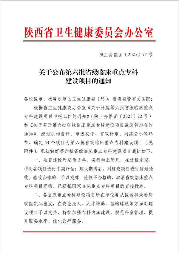 3月11日,陕西省卫生健康委员会办公室正式发布《关于公布第六批省级临床重点专科建设项目的通知》,我院肾病内科、耳鼻喉科凭借扎实的学科基础与突出的综合实力,成功获批第六批省级临床重点专科建设项目。