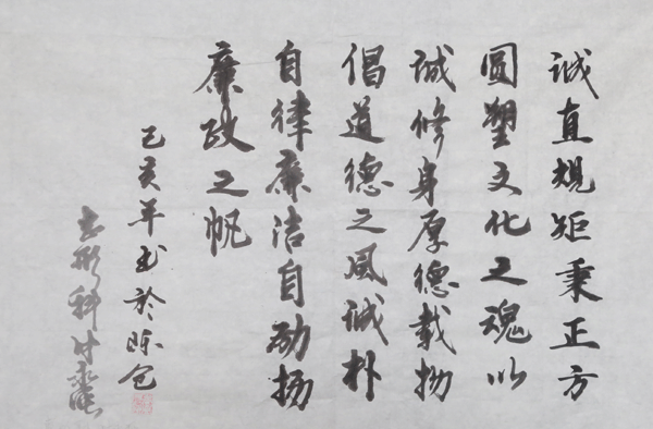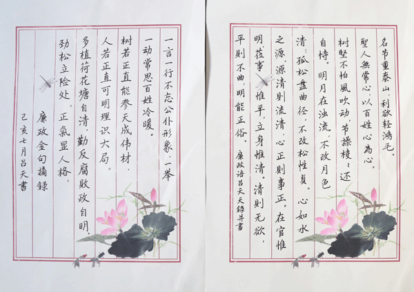 征集时间为期20天,在院党委支持下,各党支部积极动员,全院干部职工热情参与,截止8月31日,征集到作品19幅,有毛笔和硬笔书法,字体有行书、楷书、小篆等,主要内容有习总书记讲话、名言警句、古今廉政格言等。