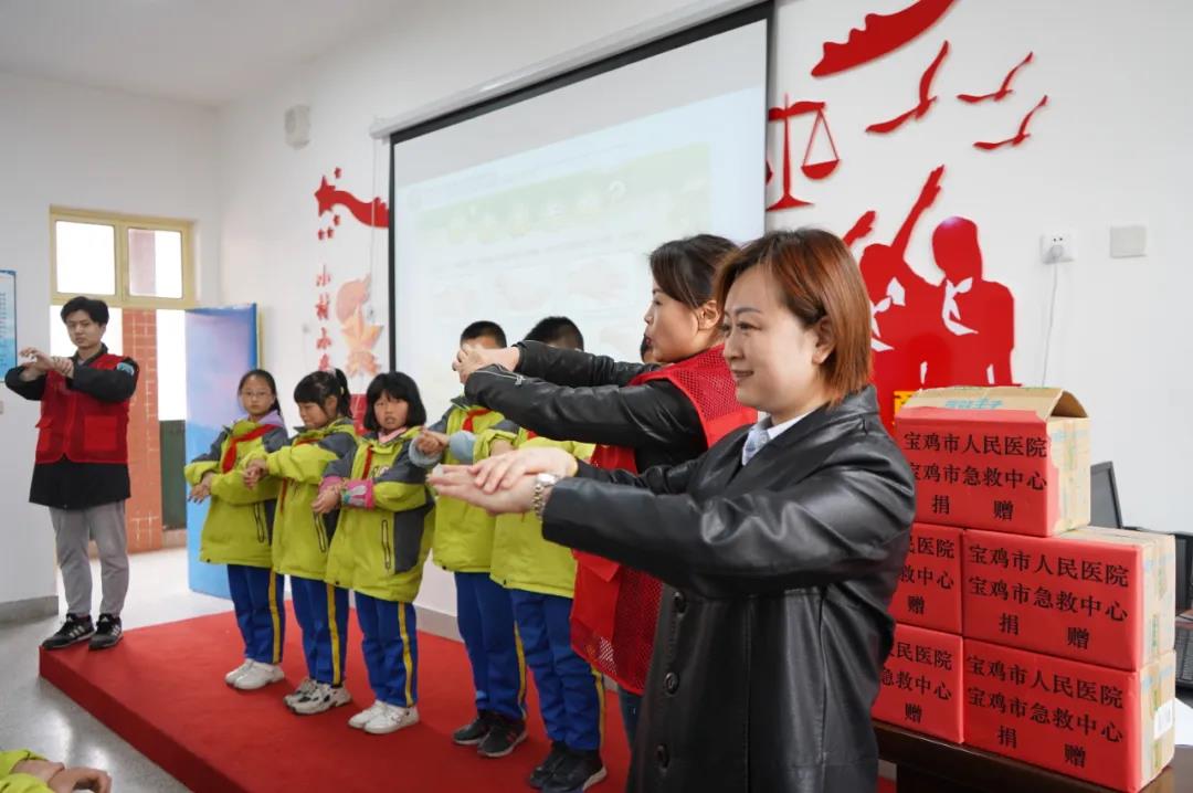 活动现场,眼科三病区主任李曼和护士长赵媛媛带领团队分两组对全校126名同学进行了视力检查和眼疾筛查。他们详细记录每个孩子的检查结果,并逐一对学生们体检情况进行耐心解释,教授爱眼护眼方法,提醒大家一定要远离手机、爱护眼睛、快乐成长。急救中心喻绍泽主任团队为高年级的同学们和老师现场指导急救心肺复苏的操作技巧。他们耐心的向同学们讲述了人人掌握急救技能的重要性和遇到突发应急事件如何快速处理并正确拨打急救120电话,让孩子们掌握了突发状况下的急救技能。第一党支部党员控感科雷娜为孩子们进行了防疫知识宣讲,通过开展防疫知识通关测验等互动游戏,帮助学生掌握正确洗手、戴口罩、感冒及发烧自测方法,提升学生的防疫知识和健康理念。高英书记一行人还为同学们购买了牙刷套盒,倡导孩子们讲卫生、勤洗手、常刷牙,养成健康的生活习惯。志愿者们认真负责、耐心细致和同学们互动,为了把每一个孩子细心地筛查完,连口水都顾不上喝,他们的敬业精神受了学校老师和家长的高度肯定和赞许,学校特意为医院赠送锦旗表达谢意。